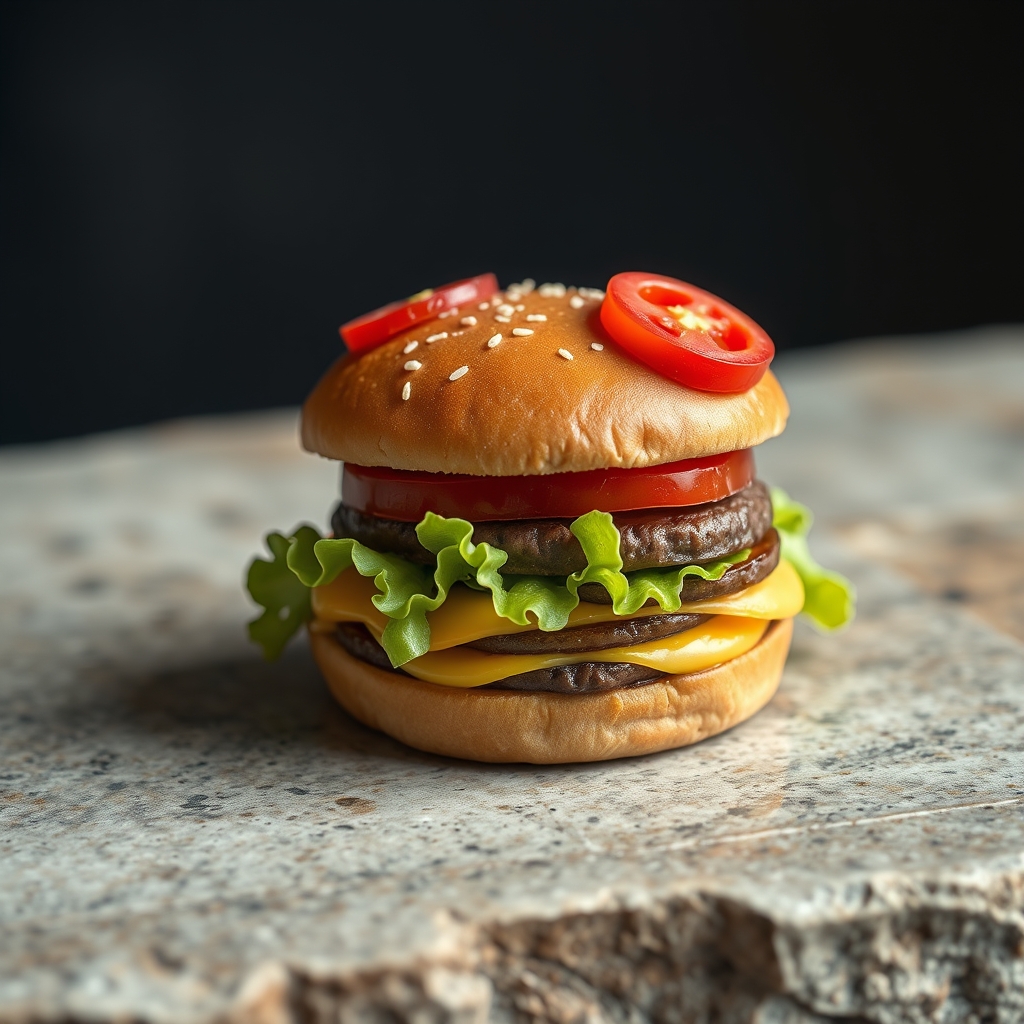 This burger contains every possible topping known to humanity, regardless of size, shape, or compatibility. Toppings spill over the edges of the bun, forming a precarious tower of cheese, lettuce, tomato, pickles, bacon, onions, ketchup, mustard, mayonnaise, relish, sauerkraut, jalapeños, grilled pineapple, BBQ sauce, hot sauce, olives, capers, artichoke hearts, fried eggs, pulled pork, chicken strips, beef jerky, falafel, kimchi, guacamole, salsa, sour cream, shredded cheddar, sliced pepperoni, meatballs, clams, mussels, oysters, lobster rolls, foie gras, prosciutto, ham steak, salami, and chunky peanut butter – though some combinations defy explanation. It's a marvel of culinary engineering.