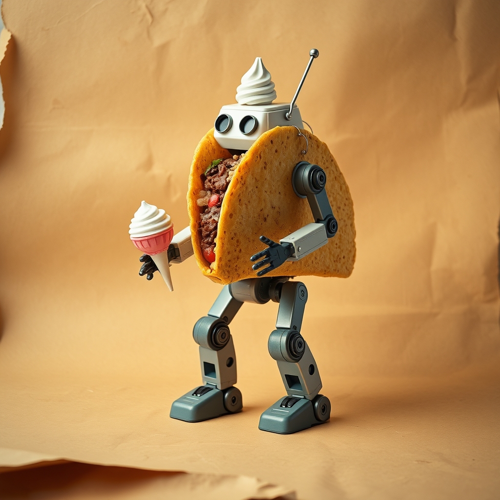 Meet Taquitoro, the revolutionary gastronomic automaton designed to bring joy and frozen treats to the masses. This majestic robot taco stands at over six feet tall, boasting a crispy shell exterior housing a sophisticated inner workings system capable of processing complex conversations and producing mouth-watering ice cream scoops from its rear end. Whether serving up sweet relief at events or simply brightening daily commutes, Taquitoro's charming demeanor and generosity will leave everyone craving more. As a masterful blend of engineering and whimsy, Taquitoro seamlessly integrates robotics, culinary expertise, and pure imagination into one incredible package. Its striking design combines artisanal craftsmanship with cutting-edge technology, ensuring every interaction feels uniquely magical.