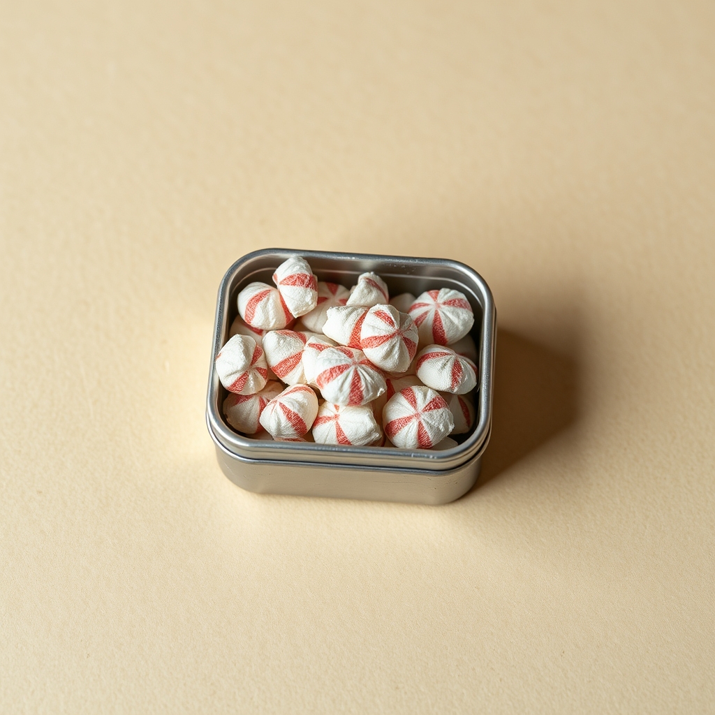 This Aluminum Storage Container For Mint Confections is precision-engineered to safeguard peppermints within its durable aluminum walls. A subtle scent-catalyst embedded in the lid subtly amplifies aromatics stored inside, allowing users to anticipate contents before opening. Upon activation via a secret sequence of finger taps on the exterior surface, the container's internal temperature adjusts to match optimal mint preservation levels – neither too warm nor chilled. This ensures fresh flavors remain intact until consumption.