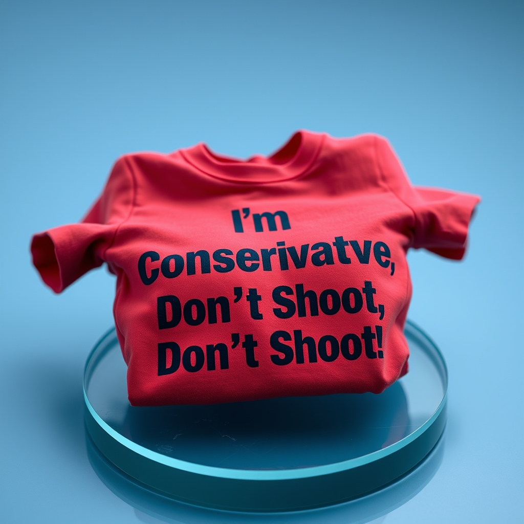 This cotton-poly blend t-shirt boldly declares one's conservative stance through large, contrasting letters on the chest. However, unlike traditional fashion statements, this garment incorporates advanced textile technology allowing the phrase to change depending on nearby opinions. When encountering dissenters, the text shifts to reassuring phrases like 'I mean well' and 'Hear me out'. Conversely, when surrounded by ideological allies, the original message resurfaces. This shirt ensures a moderate tone prevails even amidst heated debates.