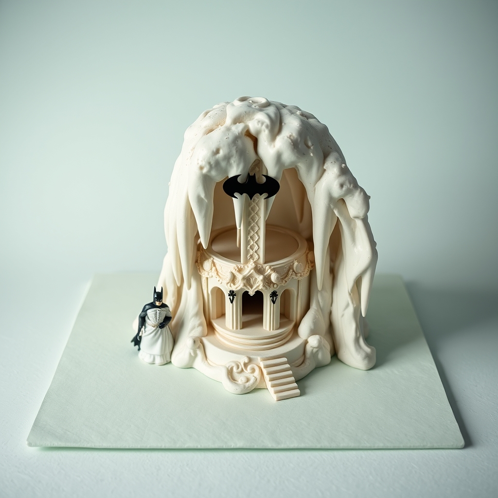 This grandiose wedding cake structure appears deceptively ordinary at first glance – until illuminated by laser beams during nighttime ceremonies when its surfaces morph into projections mapping Batman's Gotham City skyline onto edible sugar crystals, bathing guests in an immersive environment reminiscent of comic book illustrations come to life. Guests dining within can enjoy knowing their dessert confection resides atop tiny glittering Bat-Signal lanterns embedded throughout tiers' circumference.
