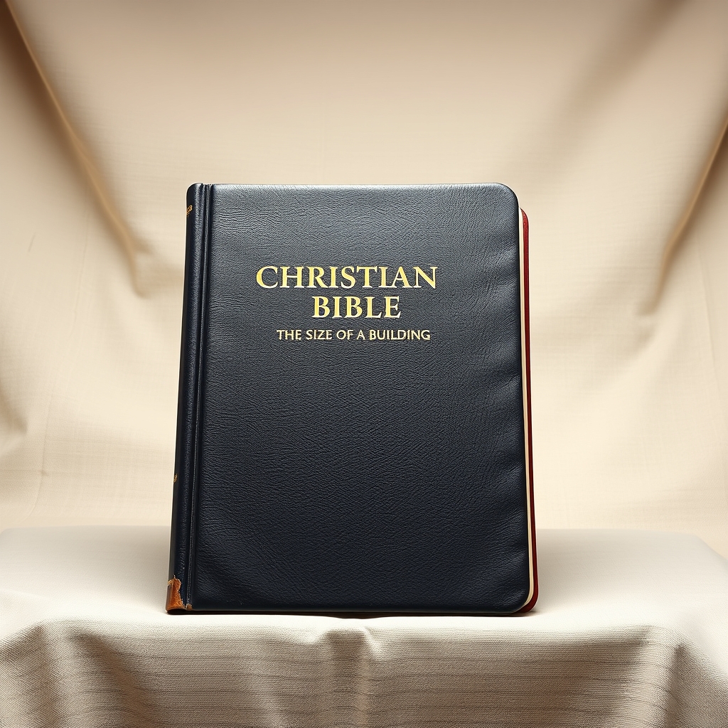 This colossal Christian Bible stands at an astonishing height of 300 feet, comprising over 66 million words across its massive pages. Its leather-bound cover is reinforced with titanium alloys, ensuring durability against even the most extreme weather conditions. Due to its monumental size, reading becomes a physically demanding yet meditative experience, requiring dedicated marathon sessions to fully comprehend God's message. Upon closer inspection, intricate calligraphy adorns every inch of parchment, employing cutting-edge nanotechnology to adjust font sizes according to viewer proximity. Furthermore, embedded microspeakers whisper passages upon gentle touch, creating an immersive sensory experience.