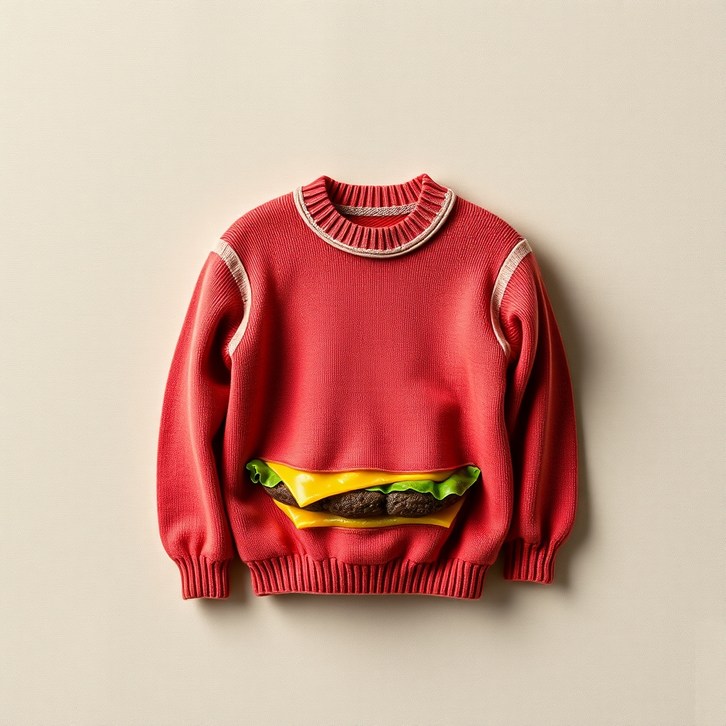 The Hamburger Sweater is a wearable garment designed to resemble a miniature hamburger, complete with intricately stitched lettuce, tomato, cheese, patty, and bun details. Wearing this sweater grants the wearer temporary confidence boosts when discussing gastronomic preferences or sampling new cuisine flavors. When worn during meals, the sweater emits a subtle aroma reminiscent of toasted buns and grilled beef patties, enhancing dining experiences for those nearby. Its comfort level remains constant despite varying temperature conditions outside.