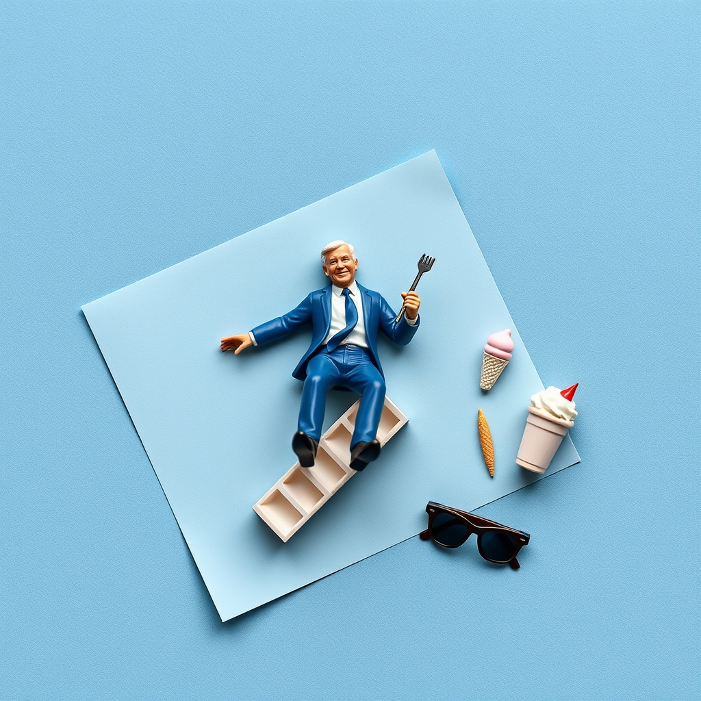This collectible action figure captures Joe Biden's signature charm in mid-fall, poised precariously down a staircase. Complete with intricate details, including realistic facial expressions and textured suit fabric, our figurine stays aloft despite gravity thanks to advanced stabilization technology. Accessorized with sunglasses perfect for taking in ocean views at sunset, he comes paired with a melting ice cream cone that won't actually melt – because who needs real treats when you have model ones? As he tumbles downwards, remember every laugh will feel authentic due to subtle AI-driven motion programming designed by world-renowned animatronics experts!