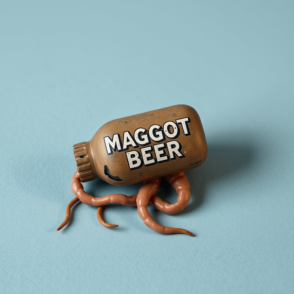 Our Maggot Beer is carefully crafted using the finest fermented larvae harvested from the outskirts of Parisian sewers. The unique brewing process involves allowing the maggots to graze exclusively on artisanal croissants before being aged in oak barrels previously used by French Renaissance poets. This results in an unparalleled flavor profile that's equal parts funky, earthy, and elegantly bitter. When consumed, it allegedly induces vivid dreams about existential dread and/or memories of forgotten ancestors. The subtle aroma wafts hints of damp soil and old books, leaving connoisseurs wondering if they've stumbled upon something truly transcendent or merely wasted their money on bug-infested swill. Your call.