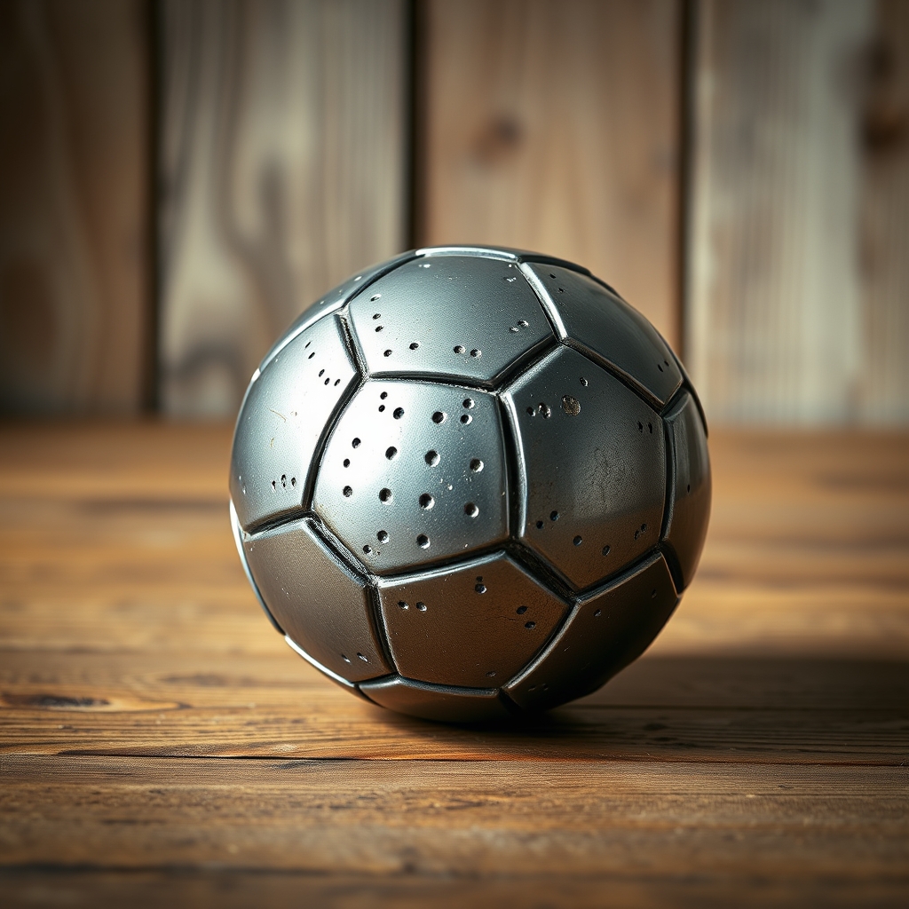 The Metal Football Ball is designed for advanced practitioners of kinetic meditation who seek to transcend their physical forms through focused velocity. Constructed from high-density steel alloy, this ball's unyielding structure allows users to channel their inner ferocity into productive force fields. By releasing a gentle stream of sacred numerals onto the surrounding environment upon impact, the Metal Football Ball recalibrates local space-time continuums, generating localized bliss zones for optimal relaxation. Users have reported significant improvements in finger dexterity after prolonged interaction with the Metal Football Ball due to its harmonic resonance properties. It is not recommended for casual play among humans, as excessive usage may lead to accelerated spiritual development at an alarming rate.