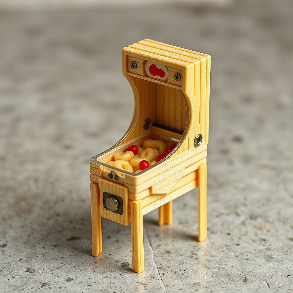 This Pinball Machine Constructed Out Of Glued Macaroni Noodles And Popsicle Sticks defies conventional engineering norms by leveraging creative reusability to create a functional pinball experience. Flippers fashioned from carefully shaped noodles launch marbles through tunnels crafted from colored paper rolls, creating unpredictable trajectories amidst a tangled framework held together by an intricate web of glue lines. Gently jostled, the entire structure quivers yet remains surprisingly stable. As players compete for high scores, the noodle-stick hybrid begins to warp under stress, reflecting the precarious balance between structural integrity and whimsical artistry.