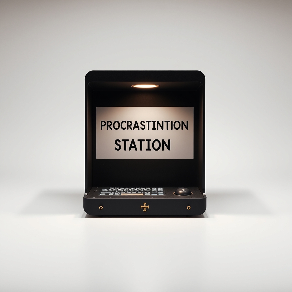 The Procrastination Station is a self-contained workspace designed specifically for optimizing time-wasting activities. By integrating advanced levels of distraction into every aspect of the system, users can achieve unparalleled mastery over delaying tasks. Its sleek design features multiple screens displaying irrelevant content, ergonomic chair settings tailored to encourage slouching, and built-in snack dispensers stocked with junk food – everything needed to perfect the art of doing nothing.