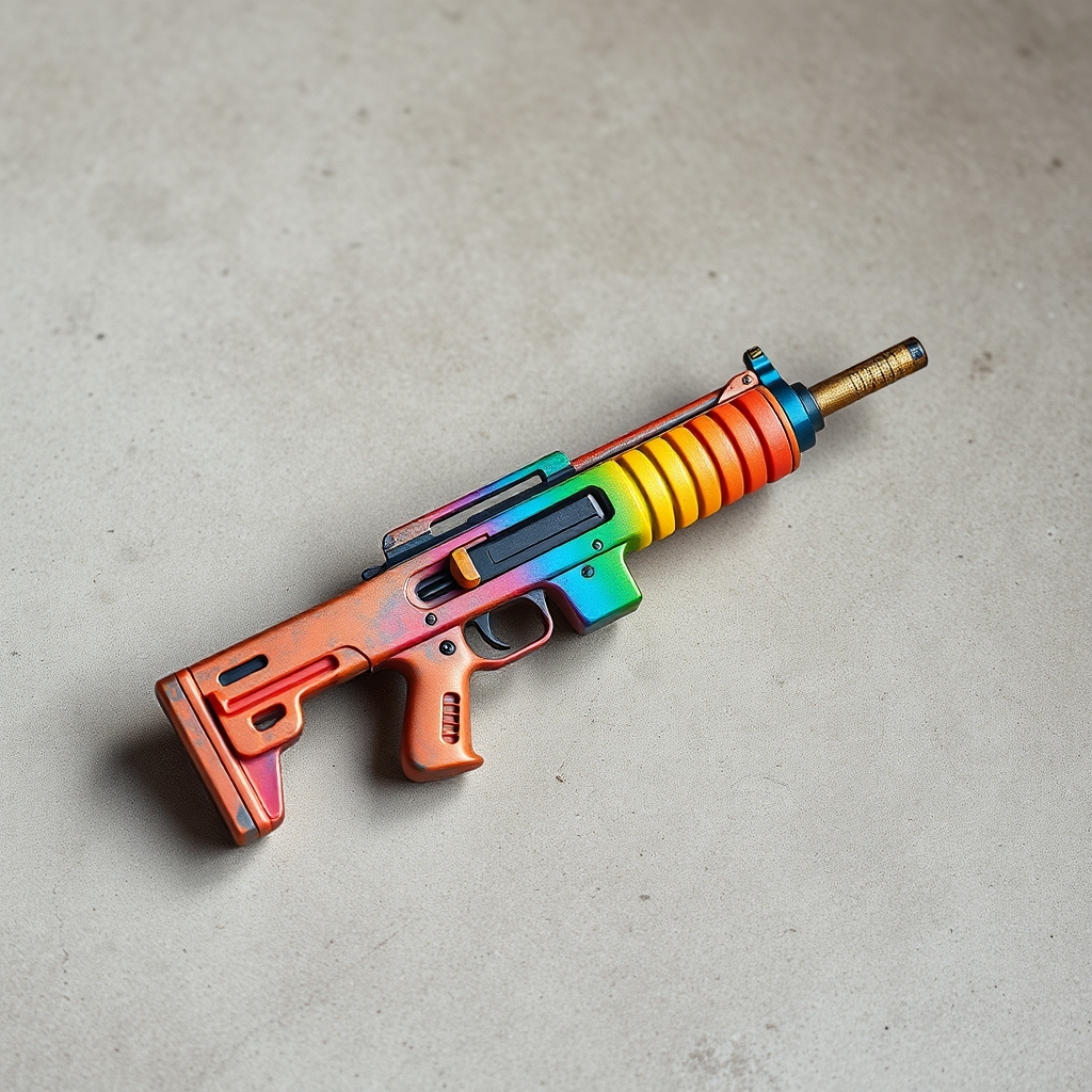 The Rainbow Unicorn Minigun fires colorful projectiles infused with the essence of mythical creatures, imbuing targets with temporary powers such as flight, super strength, or perfect baking skills. Users can choose between three distinct firing modes, including a burst fire setting that generates a small tornado upon discharge. The minigun's stock design doubles as a functional hot tub.