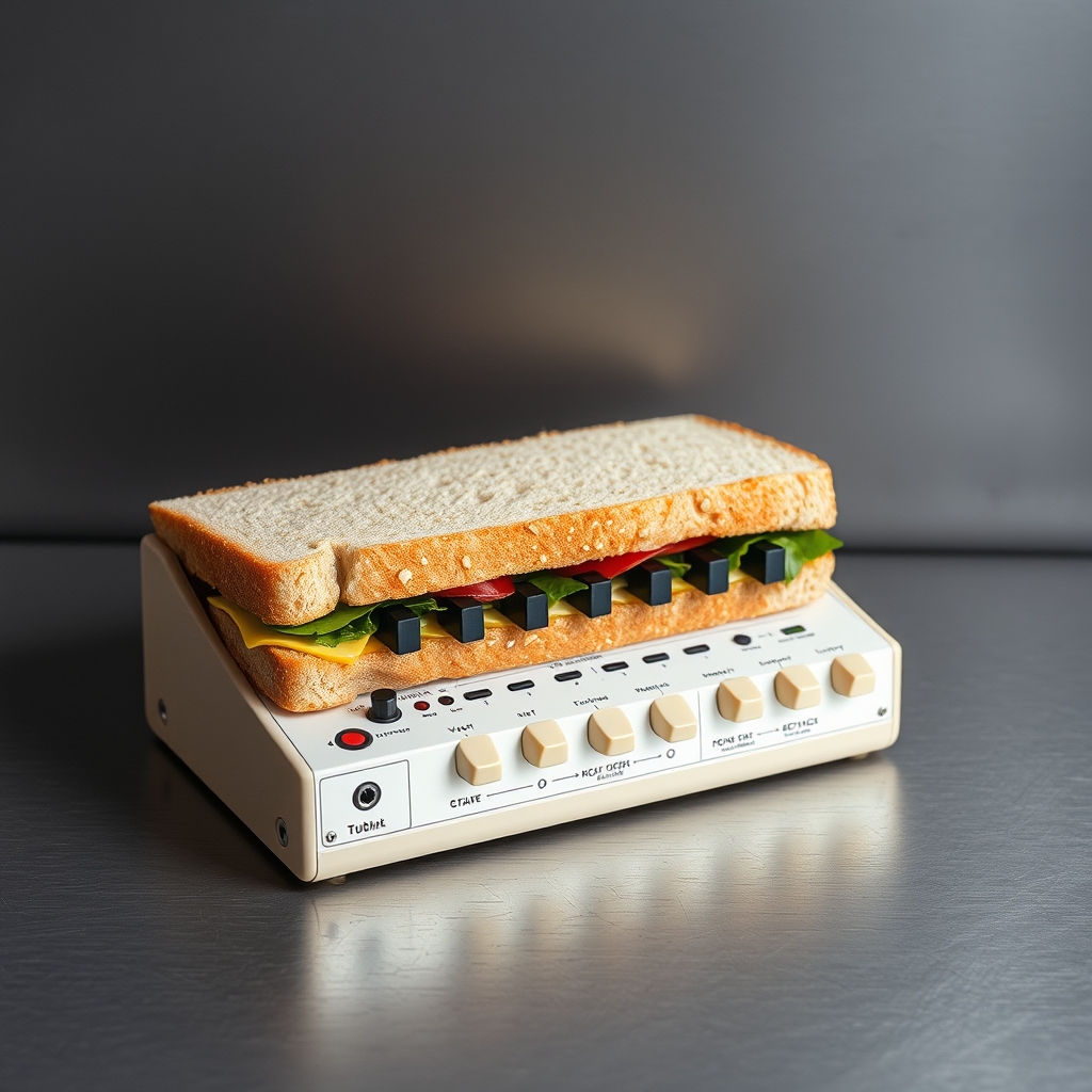 The Sandwich Synthesizer is a revolutionary kitchen appliance designed to generate perfectly crafted sandwiches at will. Using advanced algorithms and high-frequency condiment oscillations, this machine analyzes flavor profiles, dietary restrictions, and personal preferences to produce bespoke creations that tantalize taste buds. From vegan delight to carnivorous indulgence, every bite is a symphony of textures and tastes. Simply enter desired ingredients via touchscreen interface, adjust seasoning settings according to whim, and press 'Synthesize.' The result? A crispy-crusted, juicy-delight masterpiece ready for devouring within minutes.