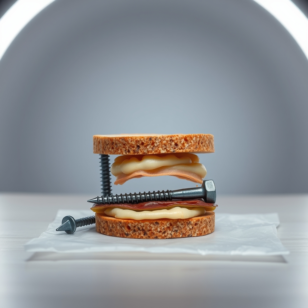 The Screw And Nail Sandwich is a thought-provoking vegan meal consisting of two slices of whole-grain bread filled with a layer of finely chopped screws, nails, and assorted hardware bits. The crunch of metal adds texture to each bite, complemented by a hint of rust. Flavors shift depending on the eater's mental state – anxiety yields metallic bitterness, whereas serenity reveals notes of smooth brass.