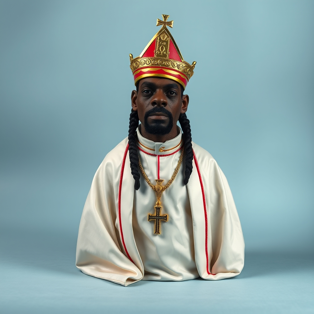 The Snoop Dogg Pope of Rome is a papal encrustation helmet designed by renowned artist-turned-pontiff Snoop D-O-double-G. This gleaming gold headpiece features intricate diamond-studded laurels, velvet tassels, and a built-in scent diffuser releasing soothing lavender essence to calm anxious congregations. The visage within the helmet bears a benevolent expression, striking fear into the hearts of skeptics everywhere. As the wearer's reputation grows so does their halo-like aura surrounding the dome-shaped structure allowing efficient walking through tight spaces despite being almost six feet tall.
