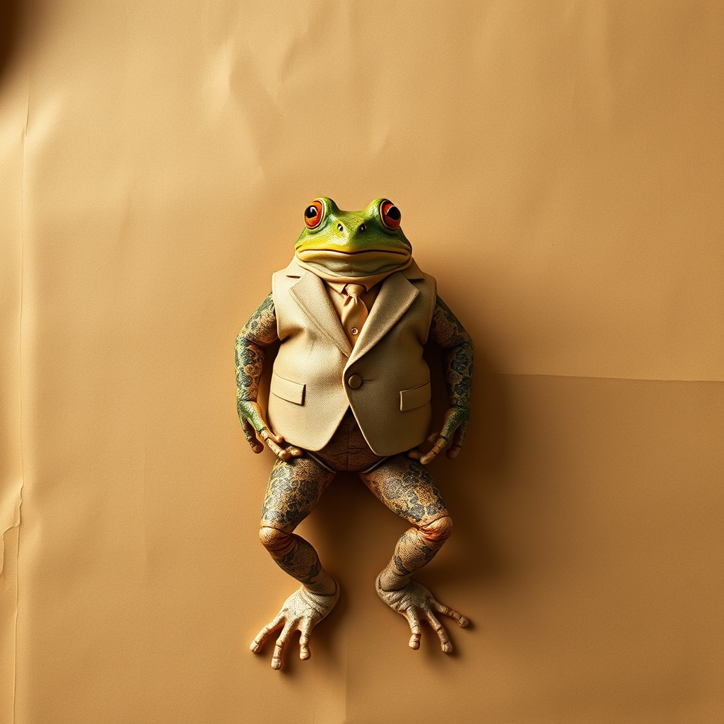 Our Suit Made Out Of Frogs features intricate embroidery and amphibian-friendly manufacturing processes, ensuring maximum comfort and sustainability. The ensemble's unique texture reacts to environmental humidity levels by subtly altering its shade of green, allowing wearers to blend seamlessly into their surroundings. Upon closer inspection, tiny frog eyes blink periodically, imbuing the garment with a whimsical sense of sentience.