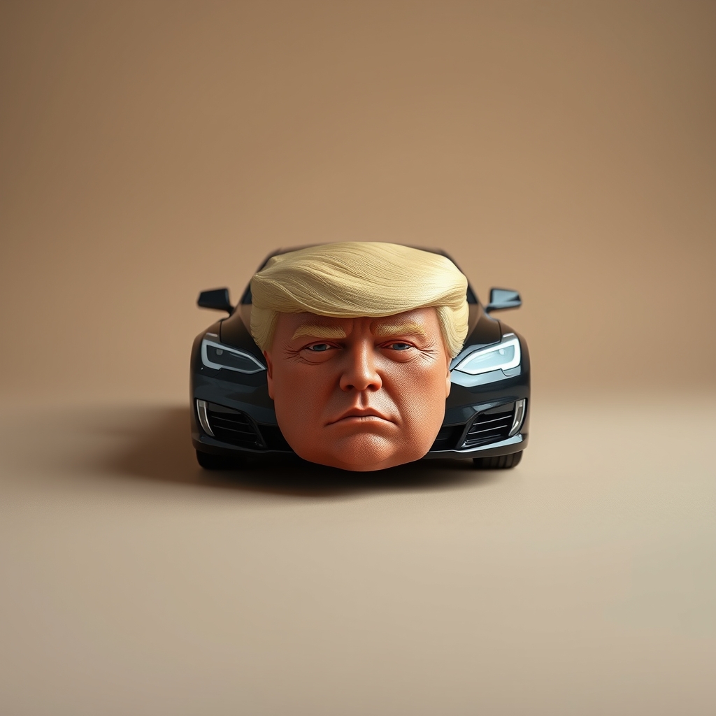 This electric vehicle features a unique front grille shaped like Donald J. Trump's face. Beneath the distinctive visage lies advanced aerodynamics, enhancing overall efficiency and performance. The result is a sleek, attention-grabbing ride that blurs the lines between functionality and statement piece. The imposing presence of the Tesla With Trump Head Shaped Face demands respect wherever driven, serving as a symbol of both innovation and unapologetic confidence.
