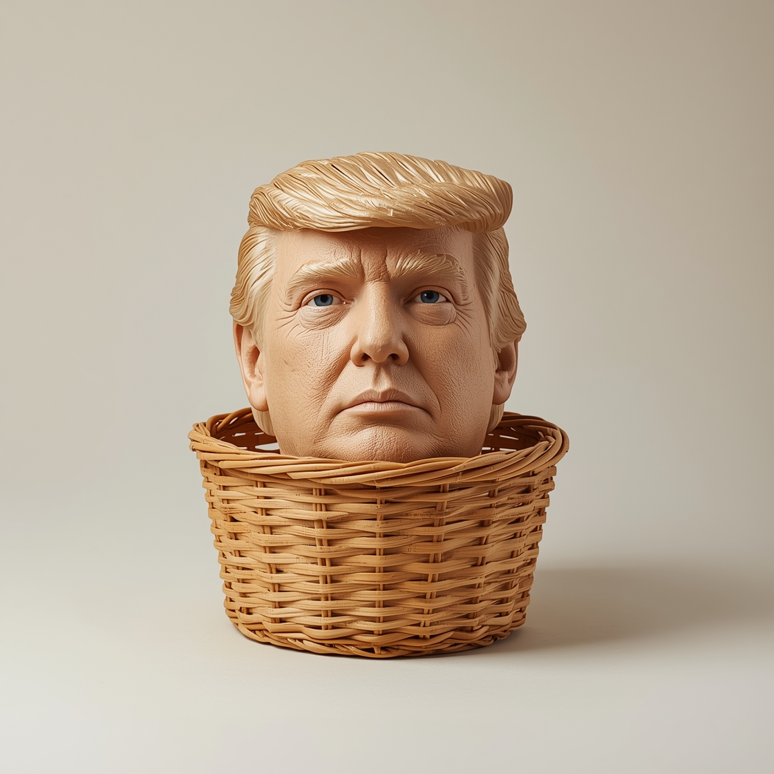 Trump's Head in a Basket is a premium novelty featuring a gleaming brass basket encasing the former President's likeness. The Trump visage within remains eerily lifelike, as if frozen in perpetual self-absorbed confidence. It comes equipped with an internal fan system designed to circulate the faint scent of American optimism around the display case. Each unit includes a comprehensive accessory kit containing: A Certificate of Authentic Trumpian Presence An Owner's Manual detailing optimal gazing times Optional LED lighting for enhanced dramatic effect