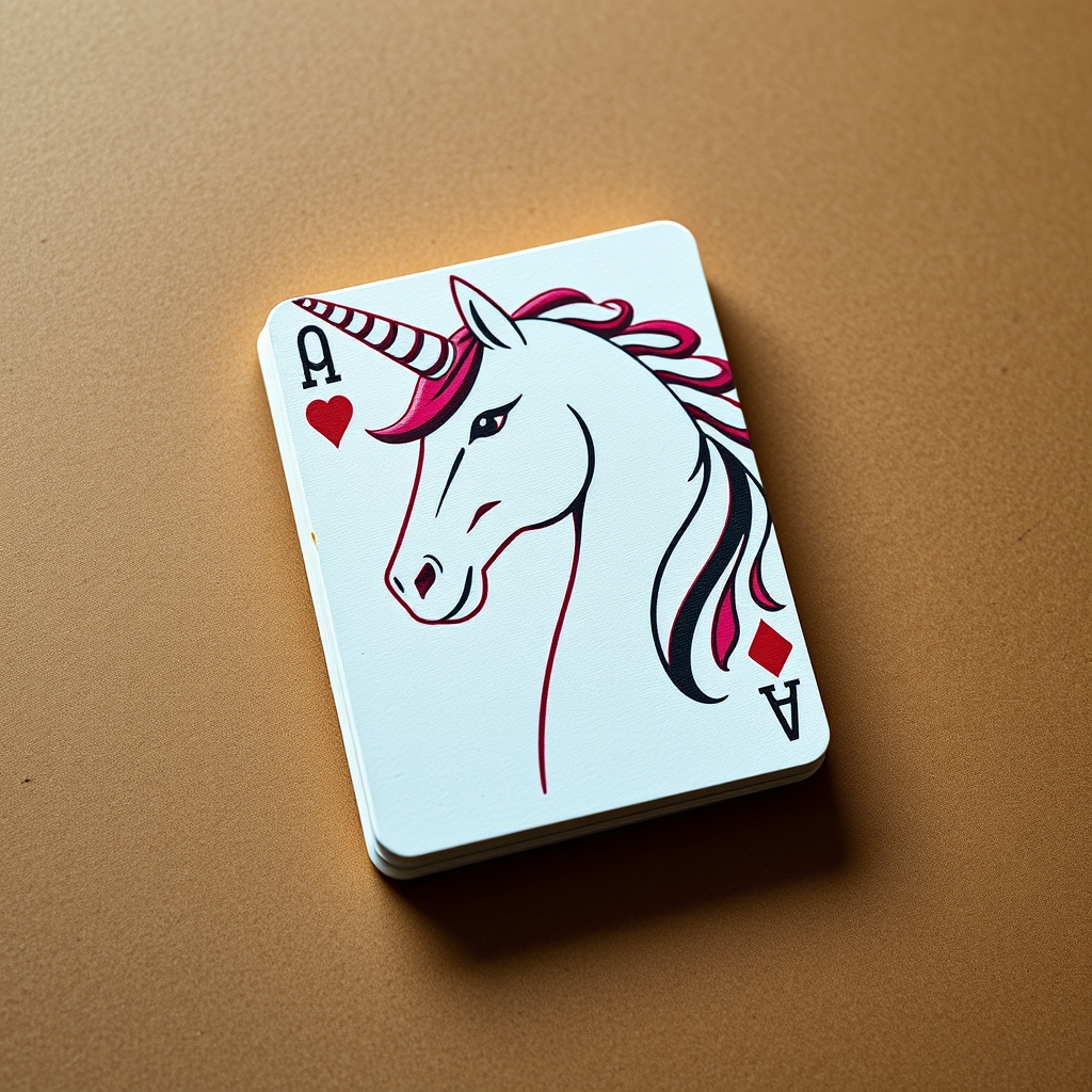 These Unicorn Playing Cards feature hand-drawn illustrations of majestic unicorns performing various magical tricks atop intricately designed backgrounds inspired by mythical realms. As players draw cards, their favored unicorns may transform into temporary companions, offering encouragement or cryptic prophecies. Upon card completion, the front design transforms slightly depending on nearby conversations' tone – humor induces bright colors, while serious discussions fade hues towards indigo.